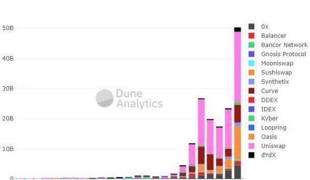 進入2021年,加密市場看似并無從2020年年底的熱潮中退燒的跡象,隨著新一輪普漲的到來,1月去中心化交易所成交量再度大幅改寫了原有的歷史記錄,月成交量突破了500億美元,DEX用戶總量也已超過118萬人,加密貨幣交易競賽的天平又一次開始向著DEX傾斜。