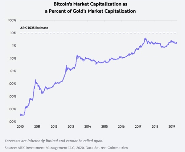 ARK 認為,作為首批全球數字貨幣的有力競爭者,比特幣的需求量將至少應與黃金相近。然而,數據證偽了比特幣存在泡沫的假說,如下所示,比特幣的網絡價值(或市值)才不到黃金的 2%。