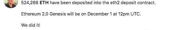 524.288ETH已經存入了eth2.存款合同,以太2.0起源將于12月1日晚上12時,我們成功了。