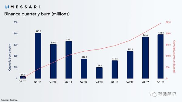 從以上公鏈的交易費用捕捉方面,幣安2019年銷毀的BNB總費用跟比特幣全年交易費用處于同一量級。