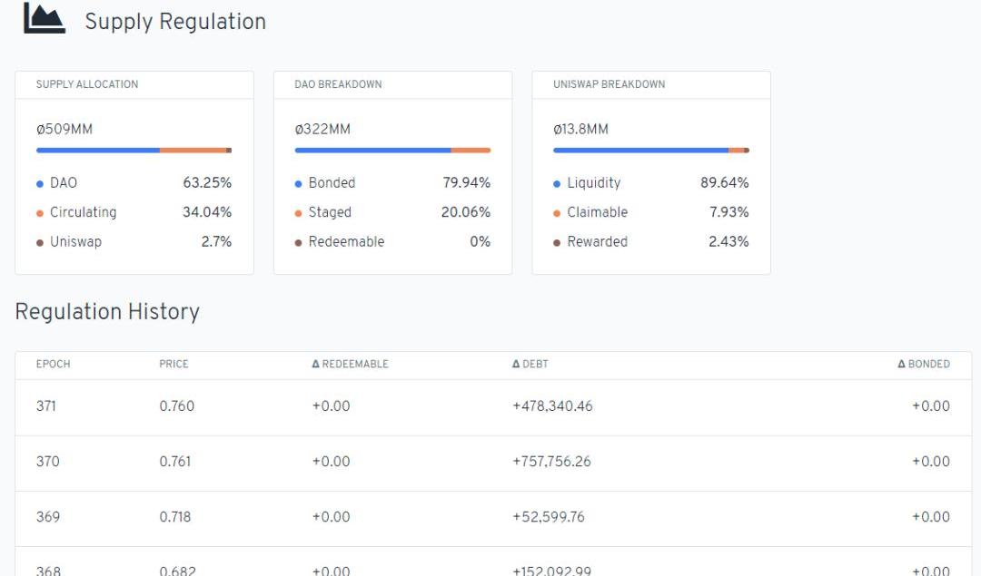 ESD目前供應量5.1億,市值3.78億美元,盡管ESD的價格已經從高點下跌了接近一半,EmptySetDolla的市值依然超越了Ampleforth,是目前市值最高的算法穩定幣項目。ESD既是其中的穩定幣,也可以代表通過DAO申領增發的代幣的股權,通過抵押ESD允許用戶獲得供應增加以及參與治理的獎勵。