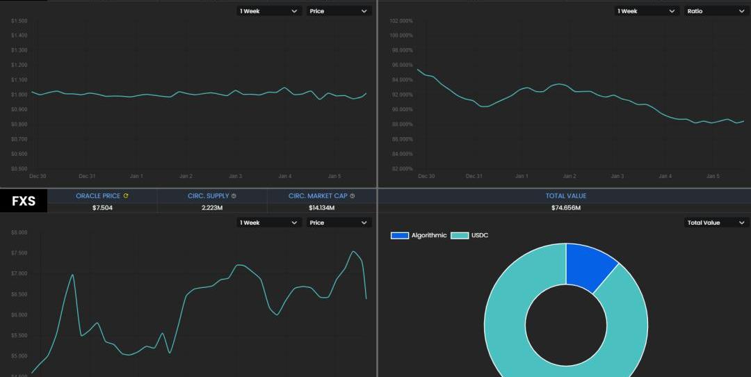 由于FRAX價格低于1美元,導致FXS不能很好的利用,在上線不久后Frax即進入類似死亡螺旋的情景,直至FRAX重新回到需要100%的USDC抵押的狀態,FXS在短時間內從20多美元跌至5美元。好在項目在上線之前就已經獲得了很高的關注,ETH的上漲與其它項目支持使FRAX的價格重新回到1美元以上。現在FRAX的供應量已經達到7600萬,抵押率也降至88.75%,這意味著鑄造FRAX需要消耗11.25%的FXS,FXS的價格也回到了7美元。