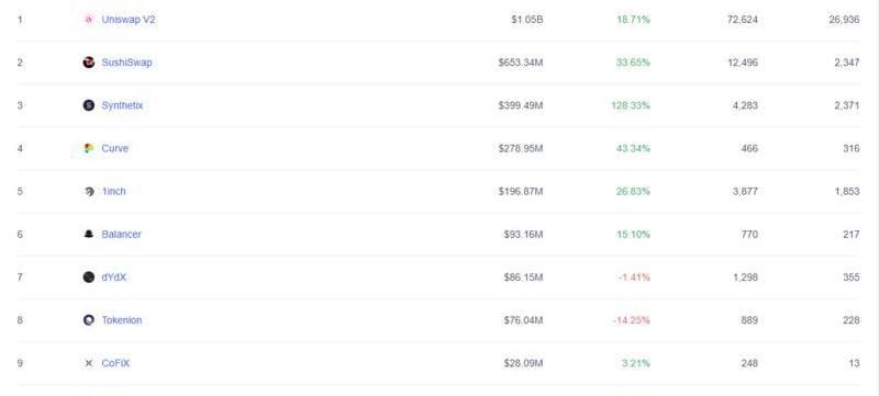 在DEX領域,據OKLink2021年1月5日數據,按24小時交易量排名前十的去中心化交易所依次為: