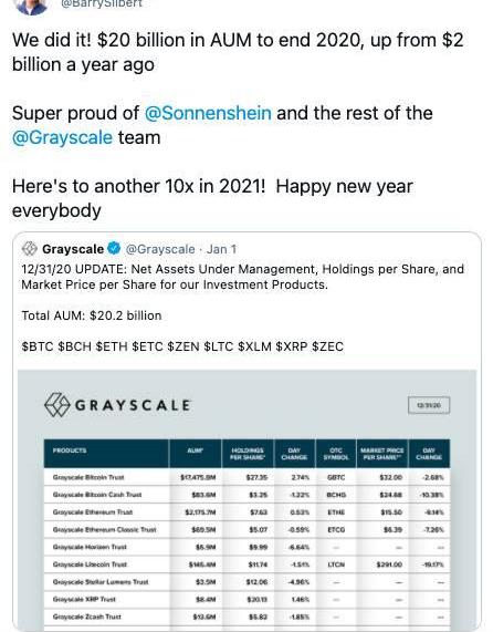 在2021年1月1日,Silbert宣布已成功兌現承諾。據官方推特消息,截至2020年12月31日,灰度資產管理總規模達202億美元,而一年前僅為20億美元。