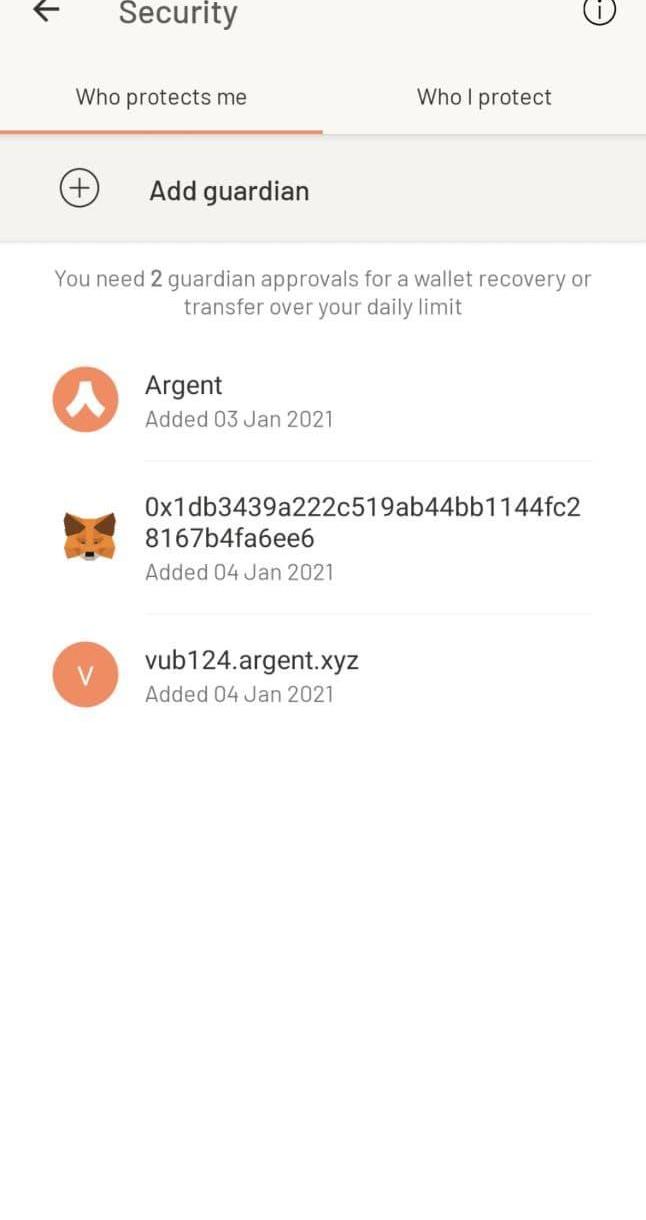 Argent錢包是首個,也是目前最流行的“智能合約錢包”,而社交恢復是其主要賣點之一。Argent錢包包括一個可以添加和刪除守護人的界面: