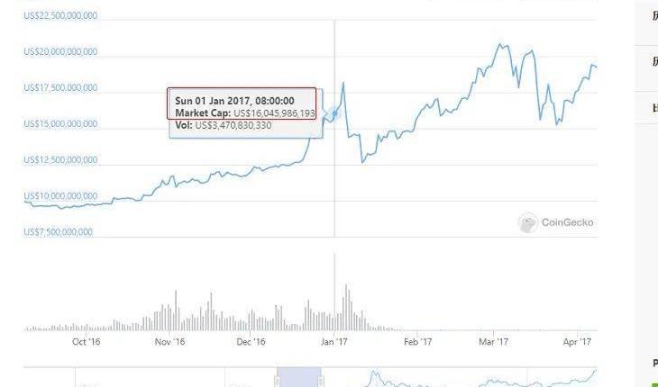 上圖是2013年年底比特幣達到人生中第一個1000美金大關,然后看1000美金的這根橫亙的線,等到2017年1月1日幣價達到998美金,再次觸碰1000美金。如下圖: