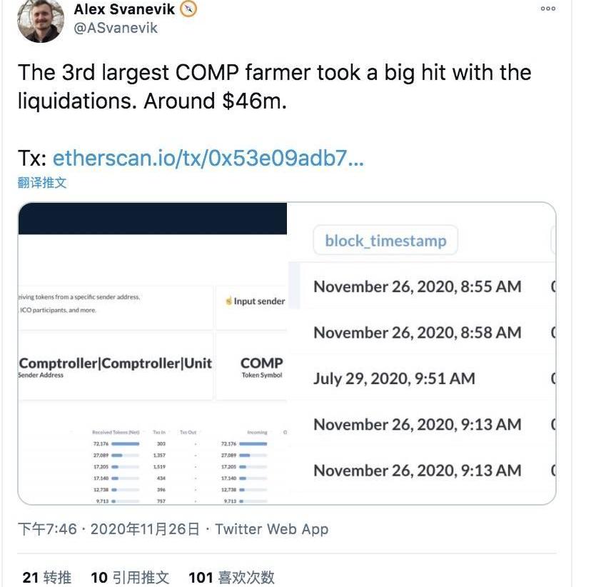據悉,在這次預言機價格操縱事件中,此前排行第三的COMP代幣收益挖礦超級大戶被清算了4600萬美元的抵押品。
