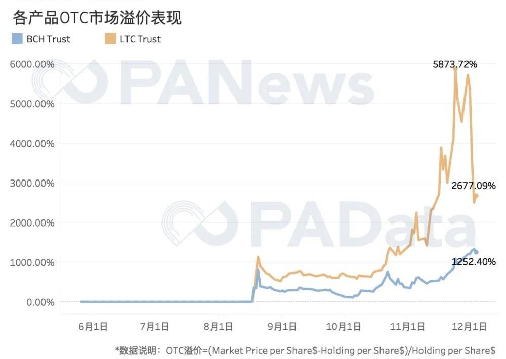 另外值得關注的是LTCTrust和BCHTrust今年的溢價表現。從灰度披露的數據來看,LTCTrust份額的全年平均溢價率高達948.11%,當前溢價約為2677.09%,最近半年最高溢價約為5873.72%。溢價同樣異常高的還有BCHTrust的份額,根據統計,其全年平均溢價率約為468.16%,當前溢價約為1252.40%,全年最高溢價約為1331.99%。