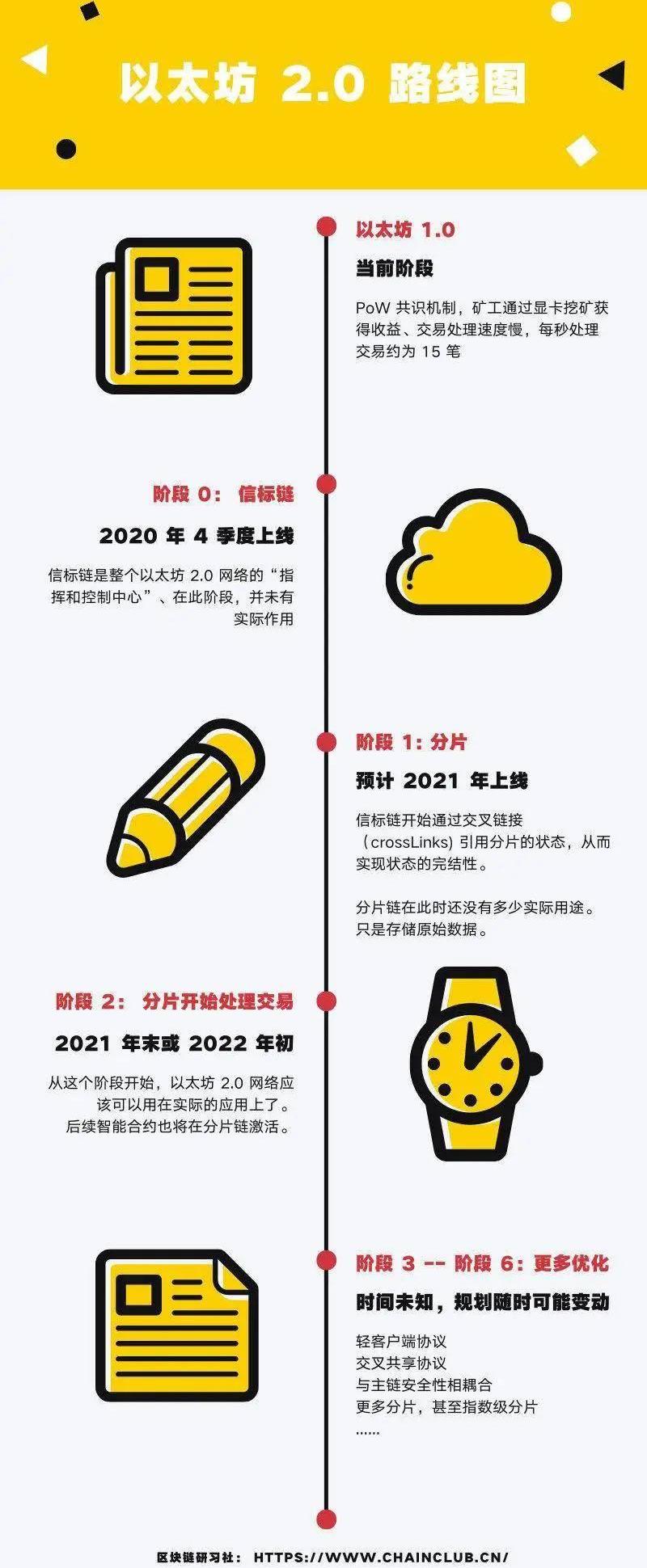 目前以太坊2.0上線的是階段0信標鏈。信標鏈是以太坊2.0的核心組件。如下圖所示,在階段0信標鏈之外,以太坊2.0還有兩個主要階段,階段1和階段2。近日以太坊基金會修改了路線圖,下圖中階段2采用的分片方案被凍結,轉而使用Layer2方案Rollup來解決以太坊至關重要的可擴展性問題。