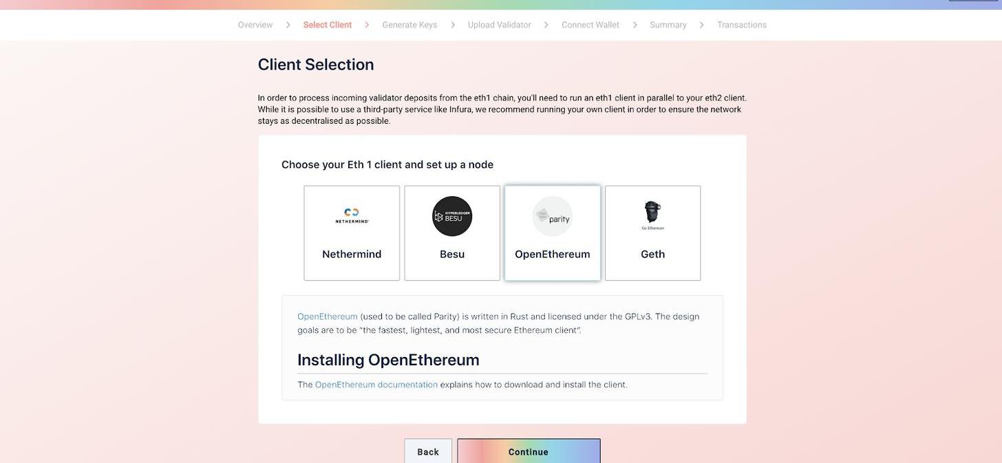 要在以太坊2.0上運行一個驗證節點需要運行一個以太坊1.0的節點,以便監視驗證節點的32個ETH存款。在選擇以太坊節點時有很多選項,下文可以找到最常用的于啟動以太坊節點的工具。