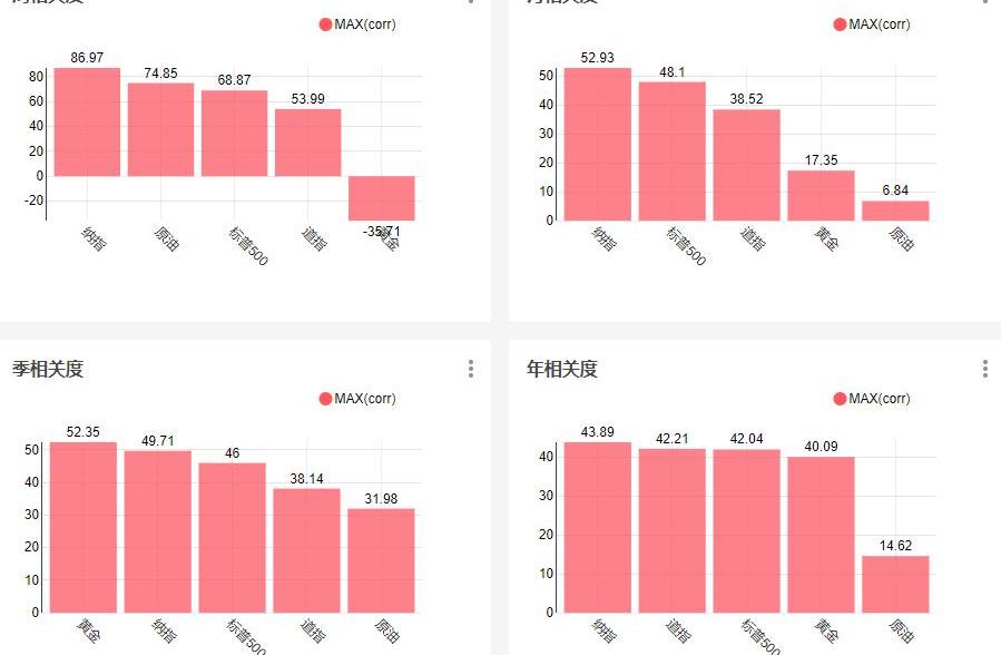 除了對比BTC與各類資產的走勢,我們還同時計算了它們之間在不同時間段的相關度、收益率,得出了一些對交易比較有參考意義的結論。