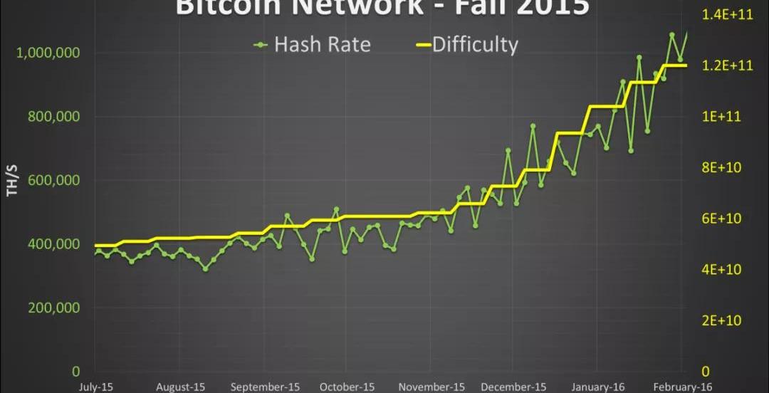 2016年在10月份前后出現了小幅的難度調整。同時,網絡哈希率和難易度的增長速度在相同的時間框架內減緩,但是數值仍是上漲的。