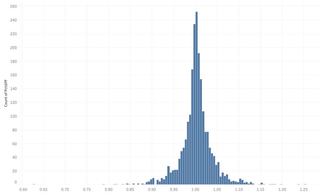 這個分布近似以1為中心,標準差可以計算出來,為0.038788,換句話說,標準差大概為3.9%。