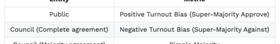 當提案通過與之相關的特定投票指標時,提案就會獲得通過。根據誰提出的公投,決定了需要多少用戶才能通過它們。你可以看到下面的表格,其中顯示了提議公投的實體和定義需要多少用戶投票才能通過公投的指標。