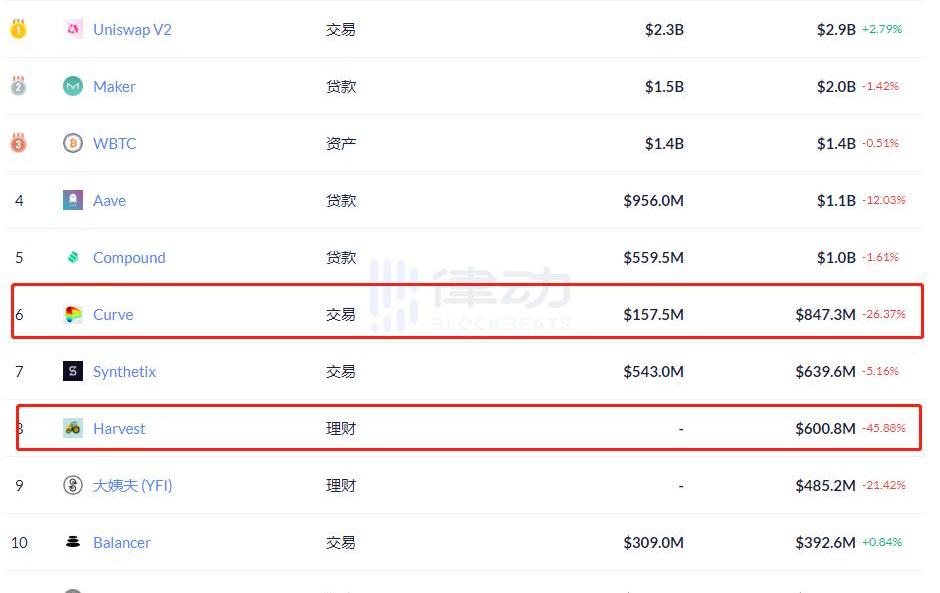 受此事件影響,不少用戶擔心資產安全,紛紛提現轉賬,加上黑客操作及套現行為,根據Debank數據顯示,去中心化交易平臺的單日成交量創歷史新高,超過30億美元。同時,律動發現,Harvest和Curve的總鎖倉量開始下降,Curve24小時鎖倉量下跌26%,Harvest24小時鎖倉量下跌46%。