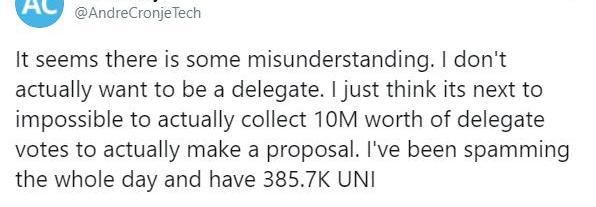 該規則要求任何希望投票的人在提案提出之前提前將其UNI委派給他,但這是一個不必要的限制,似乎只對提出提案的當事方有利,而對任何不贊成或沒有準備的人進行懲罰。