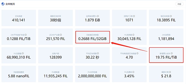 新增算力成本(19.75Fil/TB) 減去 當前扇區質押量(0.2688*1024/32)=11.148fil,這就是今天1T算力的gas費。