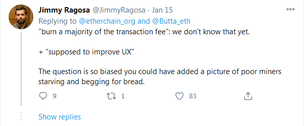 盡管也有人認為EIP-1559將有利于以太坊網絡的安全性和公鏈價值的提升(因此對礦工有益),但該提案無疑將減少現階段礦工的收入。而在Bitfly的EIP-1559推特調查下方,也有不少人表示出對礦工的同情: