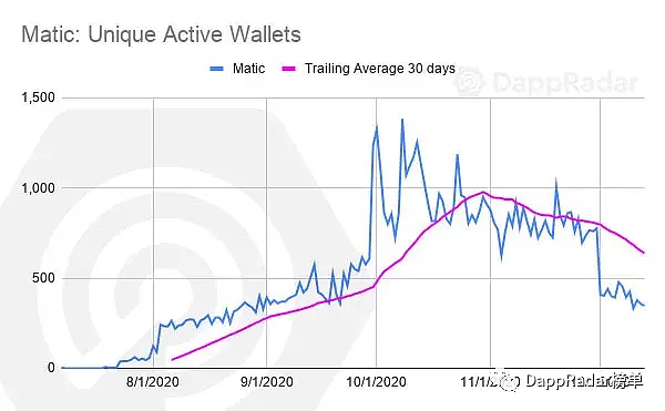 DappRadar跟蹤的最流行的第2層解決方案之一Matic,其上產生了一個相對緩慢但明顯的增長(每天大約有300個活躍的獨立錢包),這其中最大的貢獻者是0xUniverse。