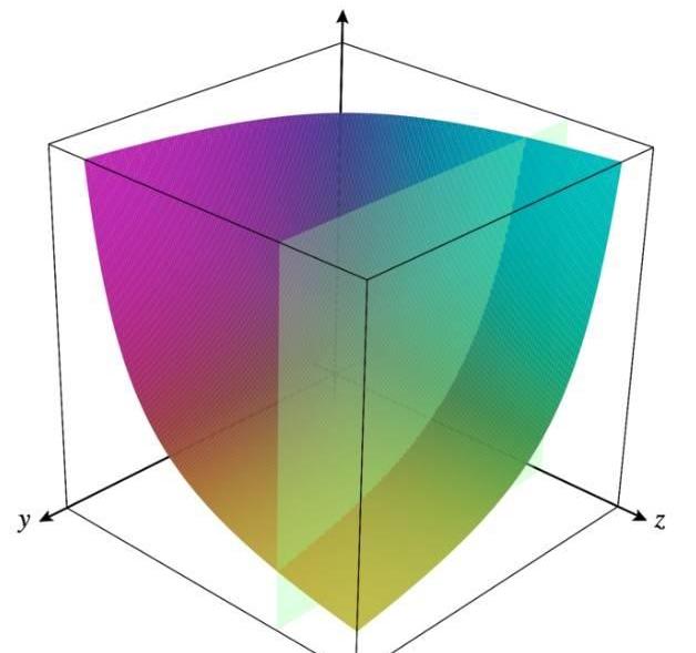 三維曲面為函數xyz=k所繪制的圖形,綠色為z=const.的平面,兩者相交即為雙曲線將z視為常數之后,剩下由x和y兩個自由度所構成的二維曲線與前述之Uniswap數學模型完全相同。