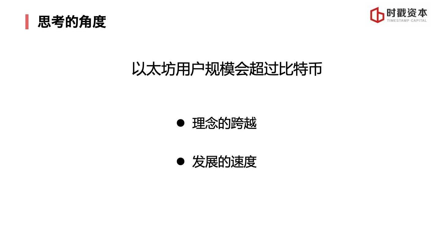 我提供一個對應的思考角度,我認為以太坊的用戶規模會超過比特幣。我的思考角度是從以下兩個方面展開。第一個方面,理念的跨越。以太坊是一種點對點的可編程數字貨幣,理念上面相比比特幣更豐富,不僅包含了現金支付系統,同時包含了更多新的功能。可編程數字貨幣,在功能上面比特幣和以太坊是子母集關系,比特幣所有的功能以太坊都有,以太坊的功能比特幣沒有。它們在對應的場景上面也是子母集關系,對應的用戶規模基數上面也是有區別,新的功能創新新的市場,新的市場容納更多的用戶,更多的用戶讓市值更大。以太坊網絡系統符合梅特卡夫定律。