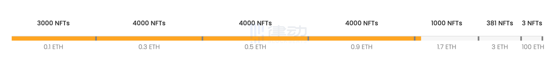 除此以外,Hashmasks 的發售方式也別具一格,采用了聯合曲線(Bonding Curve)的形式,隨著剩余的 NFT 數量越來越少,未售出的 NFT 數量也將越來越貴,從最初的 0.1ETH 到未來最高 100ETH,這種價格的上漲推動力市場上的 FOMO 情緒。