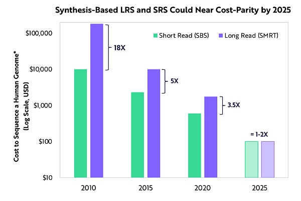 ARK認為,與短讀測序相比,長讀測序技術可以提供更高的準確性、更全面的變體檢測以及更豐富的功能集。到2025年底,高精準度的長讀測序和短讀測序的成本將相近。