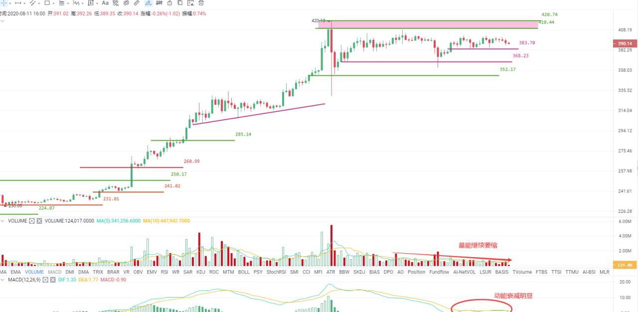 截圖來自OKEX?ETH/USDT永續合約4小時圖:目前的客觀走勢及應對策略:ETH目前短期強弱分界線在384一線,沒有跌破之前短期走勢還是偏多頭狀態,不過顯然不是什么強勢多頭。這種狀態下的應對策略是:有倉位的繼續持倉待漲,設好保護性止損,短線在384下方,偏中線那就主要盯住352就可以了,短期的波動不要太在意。