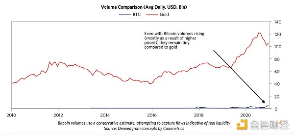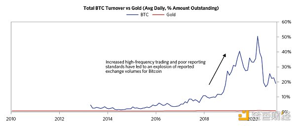 我們試圖確定人們持有BTC的原因,是將其作為財富儲備,還是更偏向于投機,觀察成交量是我們采用的另一種方式。相對于黃金,BTC高交易量可能反映了其投機性更強的特性。與BTC相比,黃金的交易量在總流通量中所占比很小,部分原因是世界各地的央行持有很大一部分黃金總供應量,作為其儲備中長期的保值手段。另一方面,近年來,由于高頻交易員的出現,衍生品市場快速發展,能與BTC交易的新代幣不斷涌現,所以BTC交易量呈爆炸式增長。在這種環境下,一些不受監管的交易所展示高交易量數據,盡管這些數據值得懷疑,但是造成了流動性增加的錯覺。實際上,這種流動性代表的更多是高波動性和投機性交易,而不是投資者更愿意承擔長期風險。