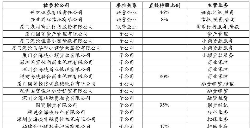 以廈門國貿為例,公司通過參控結合拓展金融布局,為實體產業提供優質的一體化綜合金融服務。公司除參股證券、信托、銀行等金融機構外,還有全資的期貨、資產管理、風險管理、融資租賃、擔保等子公司,從事期貨及衍生品、普惠金融、實體產業金融及投資等業務。