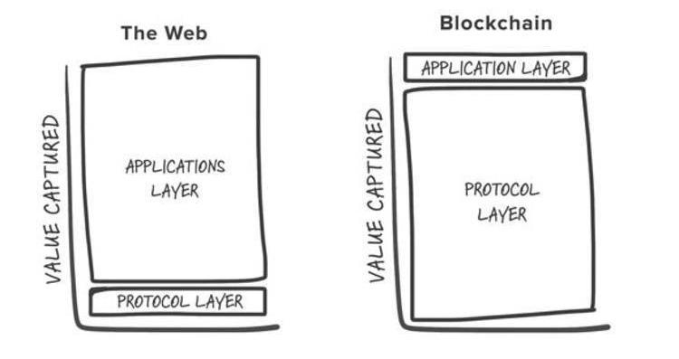 而區塊鏈時代價值將集中在共享協議層,只有小部分價值分布在應用層。由此誕生了「胖」協議和「瘦」應用。