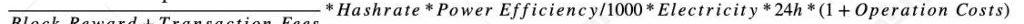 其中?BlockReward?表示每日比特幣網絡產生的區塊獎勵;TransactionFees?為每日比特幣網絡交易手續費;Hashrate?為哈希算力;PowerEfficiency?為算力功耗;Electricity?為電價;OperationCosts?為經營成本。此公式展示挖出1個比特幣礦機的生產成本。礦工邊際收益為比特幣價格扣除生產成本后所占生產成本比例。