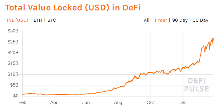 對最大及最有前途的DeFi項目持續不斷的改進使其基礎代幣價值飆升,鎖定在DeFi中的總價值達到250億美元以上。不僅如此,華爾街投資者和更多普通投資者逐漸發現DeFi的潛力也只會進一步促進這一羽翼未豐的行業的發展。投資者相信,以低成本投資、交易和控制自己財務的可能性將持續存在。