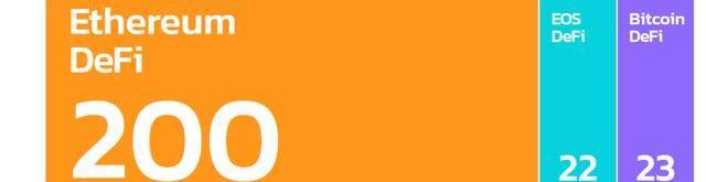 截至目前,DeFiprime數據顯示,以太坊、比特幣和EOS鏈上一共有245個DeFi產品,其中,以太坊獨占200個,且其市場鎖倉值也創歷史新高,達到12.21億美元。