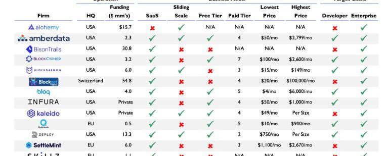 基礎設施提供商提供區塊鏈節點基礎設施服務和開發工具。他們的潛在客戶是那些希望將資源密集的數字資產部分外包出去,以及想要訪問區塊鏈節點數據的區塊鏈企業。需要源源不斷的節點數據的公司包括去中心化應用和區塊鏈數據和分析提供商。