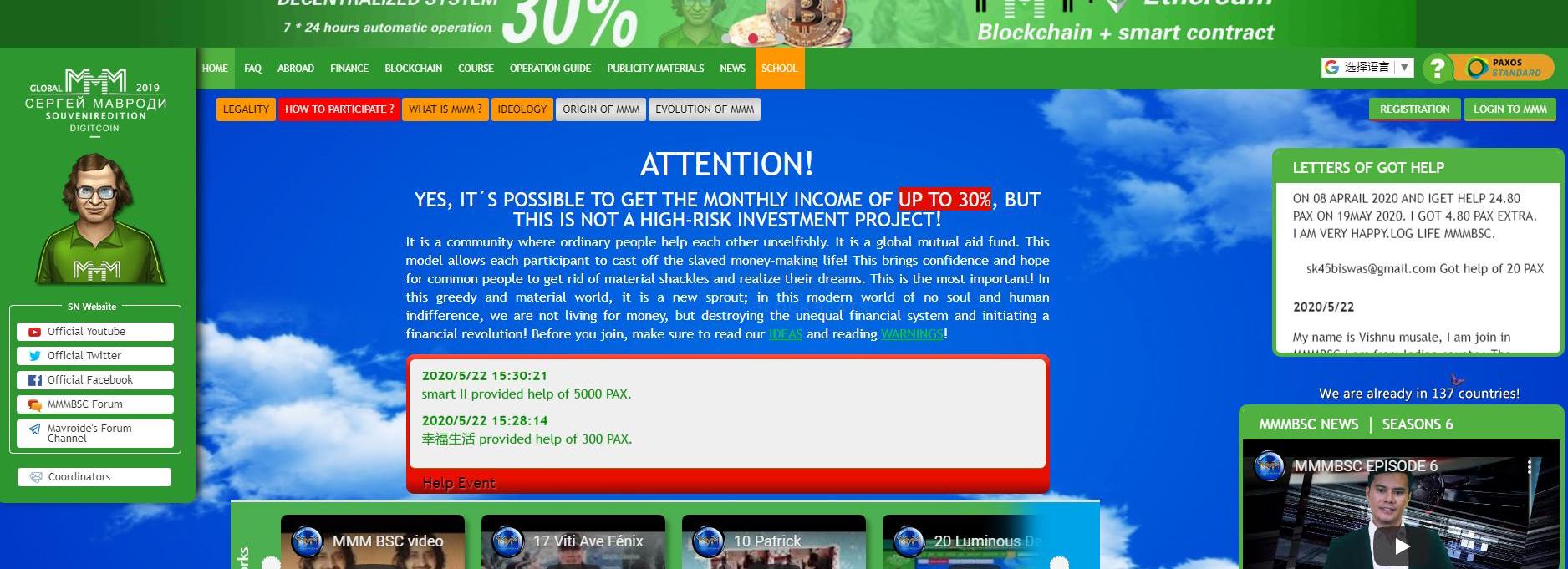 MMM這個項目行為可以追溯到MMMBSC,其風格仿造謝爾蓋?馬夫羅迪(SergeiMavrodi)的MMM企業。該企業在上世紀90年代通過可以換取高收益回報的空洞承諾籌集了數億美元資金。自從馬夫羅迪死后,MMM的龐氏騙局一直存在,包括BSC使用Paxos的PAX美元代幣進行籌資(Paxos強烈否認與該計劃有任何關系)。