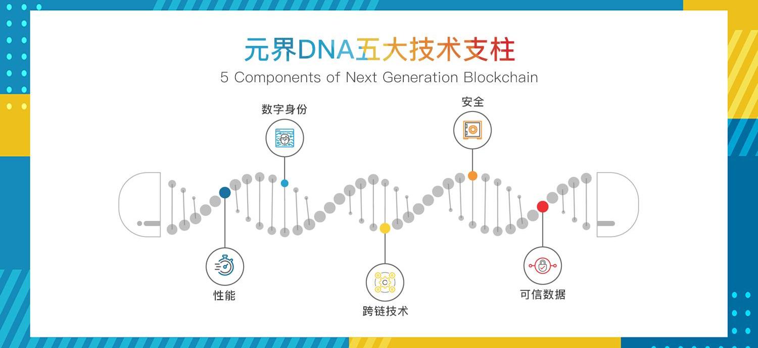 元界DNA是基于元界基礎鏈ETP開發的雙鏈網絡架構,DNA鏈采用DPoS共識機制,與采用PoW、PoS混合共識機制的ETP鏈平行運行,在保持安全和去中心化的同時,將交易速度提升至毫秒級。同時元界DNA規劃構建起公鏈的5大技術支柱,即數字身份、安全、性能、可信數據和跨鏈,進一步實現功能完備的區塊鏈底層基礎設施。