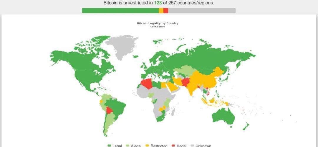 2.比特幣在全球范圍內的監管接受度更高,現在已經有50%的國家和地區對比特幣無限制;