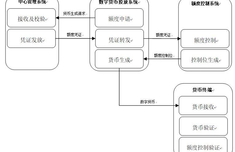 數字貨幣投放系統與額度控制系統共同構成“第一投放系統”。第一投放系統與中心管理系統再度結合,構成“第二投放系統”。