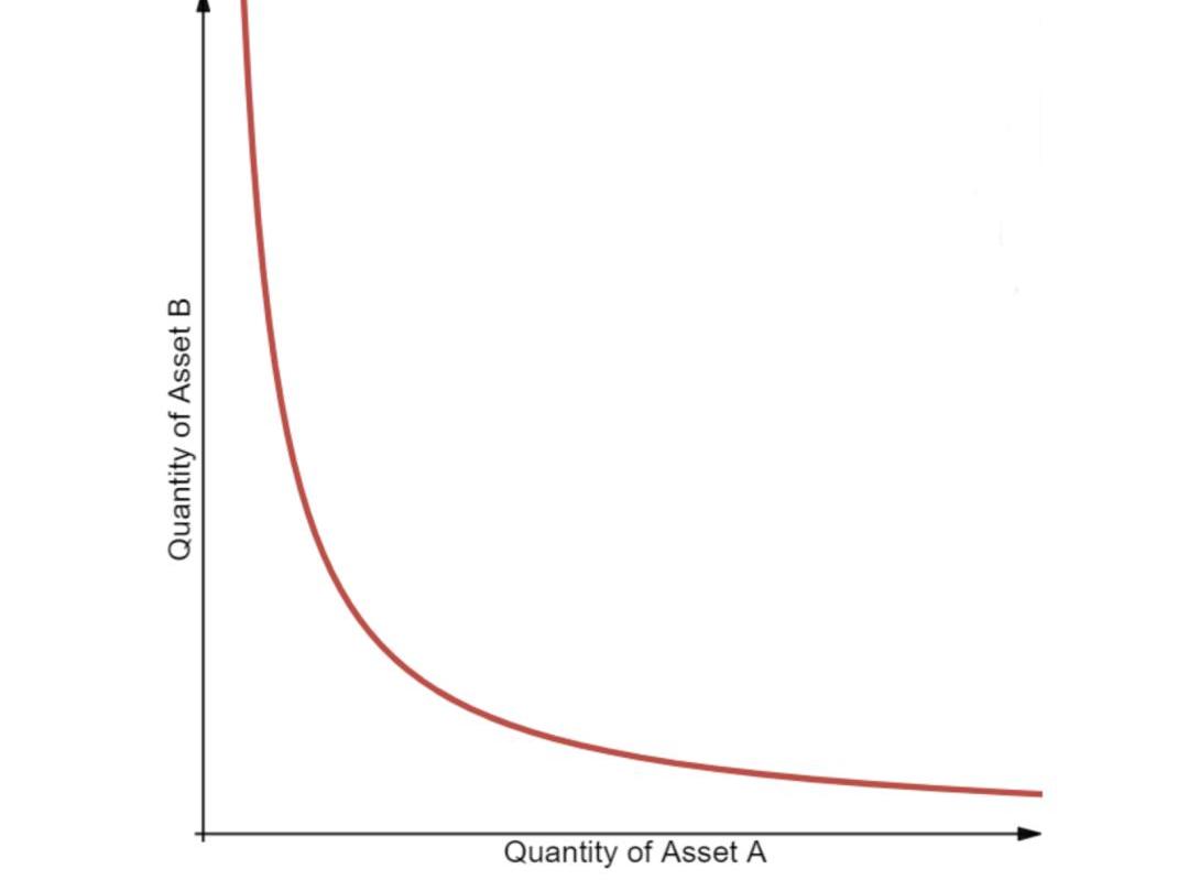 一個恒定乘積函數在描繪兩種資產時會形成一條雙曲線,其特性讓人比較滿意,因為當價格趨近無限時,流動性都不會匱乏。