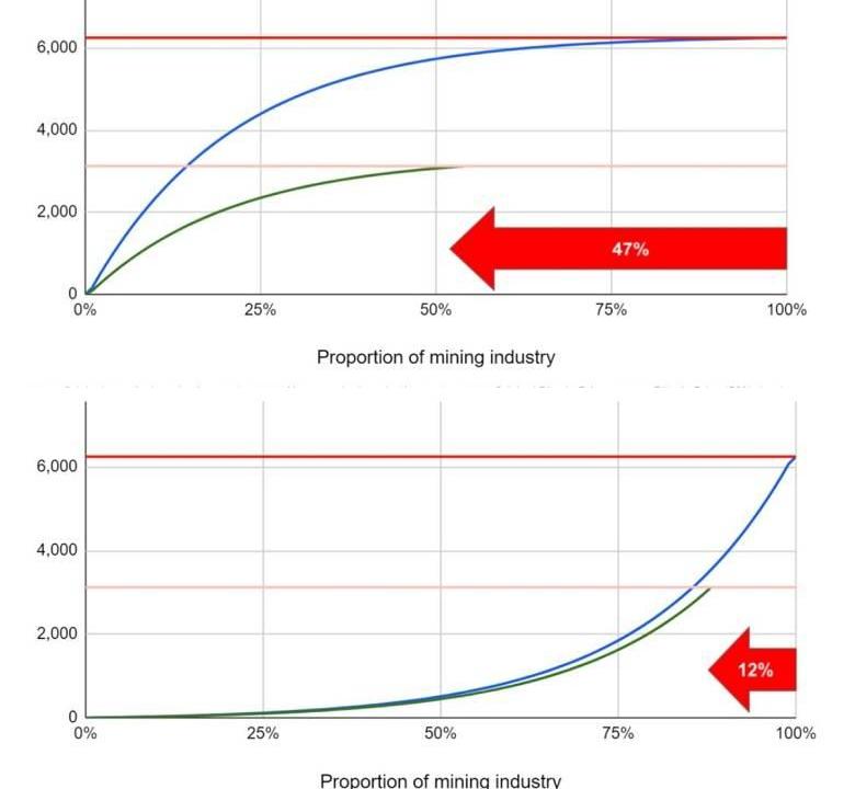 類似地,第二條成本曲線是一條“正常”曲線,顯示在減半后哈希率下降了47%。對于第三條曲線,哈希率只下降了12%。
