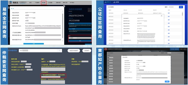 通過區塊鏈技術,易保全把公證處、版權保護中心、互聯網法院、仲裁委等機構納入保全鏈開放平臺,讓區塊鏈存證數據實時同步存證到公證司法機構的服務器上。同時,通過公證處、仲裁委、首都知產協會官網可在線查詢區塊鏈數據的相關信息,提高區塊鏈證據的司法公信力。
