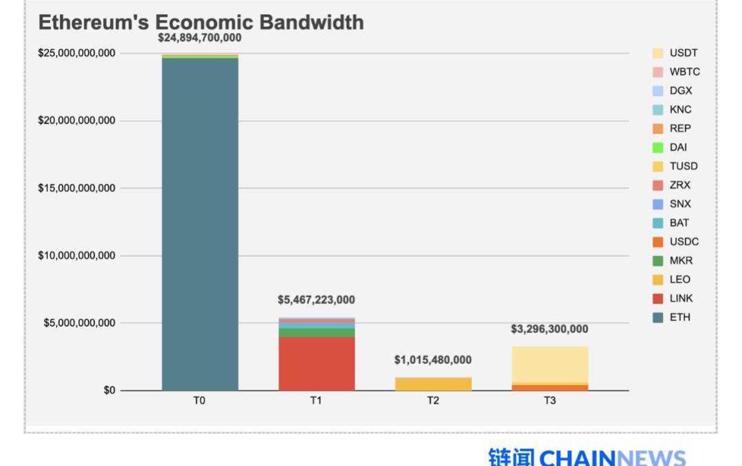 不出所料,ETH是迄今為止T0經濟帶寬的最大供應者——為以太坊生態提供了超過246億美元的帶寬。其它形式的去信任經濟帶寬包括?DAI?和?REP。
