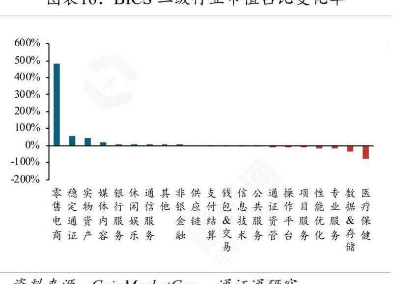 在市值排名前五位的BICS二級行業中,零售電商、穩定通證等行業市值占比明顯上升;醫療保健、數據存儲等行業市值占比顯著下降。