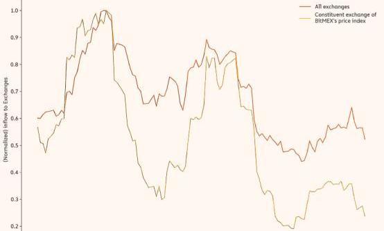 但并不能確定這一系列事件是否是同步發生的。例如,交易所流入量增加而BTC價格卻沒有同步隨之增加。隨著所有包含在BitMEX價格指數中的衍生品交易所數量增加,這種現象在未來應該不會再發生。