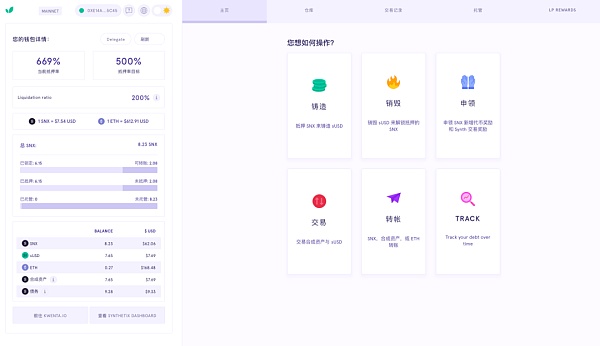 *Synthetix Mintr:SNX持有人可以在此平臺執行各種不同的操作,包括鑄造和銷毀SNX,管理抵押比率,Staking SNX等。