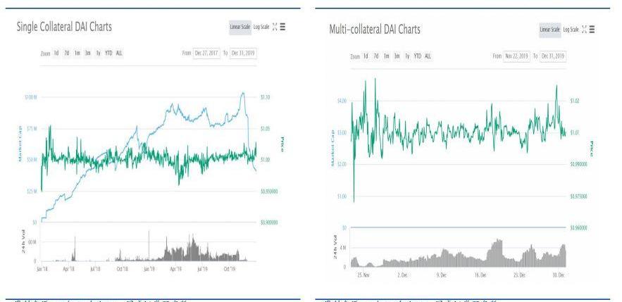 由于多抵押DAI的上線,單抵押SAI的市值一路下跌,截至2019年12月31日,SAI總市值為4079.58萬美元,24小時交易量約為61.67萬美元。多抵押DAI的總市值還未公布,24小時交易量約為464.34萬美元。DAI是從2018年6月開始增發,增發量均相比其它四者要少,12月18日多抵押DAI上線以來,增發數量激增,但其中大多數是由SAI轉換而來的。