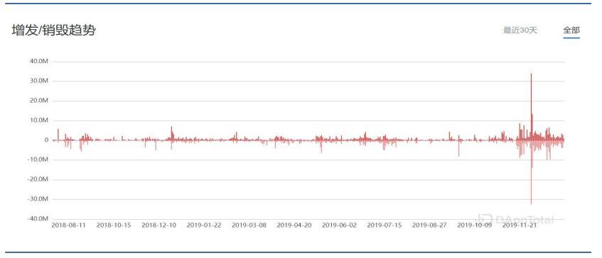 截至2019年12月31日,TUSD總市值為1.55億美元,在穩定幣市場排名第四,加密貨幣市場市值排名46,24小時交易量約為1.88億美元,2019年TUSD市值下跌25.73%。TUSD的增發期從2018年6月開始,截至2019年12月31日,最近一次增發是在2019年1月1日,增發數量約為210萬枚。相較于其它四種穩定幣的增發情況,TUSD的增發次數不多。