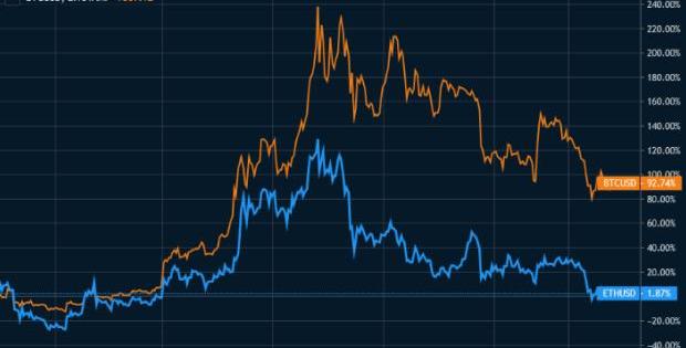 圖1:以太坊與比特幣年初至今的市場表現;資料來源:Tradingview