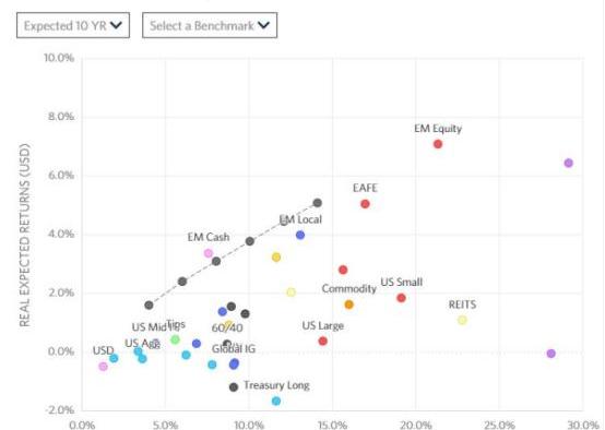 摩根士丹利的分析師告訴彭博社:“未來十年的回報前景并不樂觀。與前幾十年相比,投資者面臨更加消極的前景,尤其是與全球金融危機后的十年相比,當時的風險資產價格由正在瓦解的非常規貨幣政策支撐。”